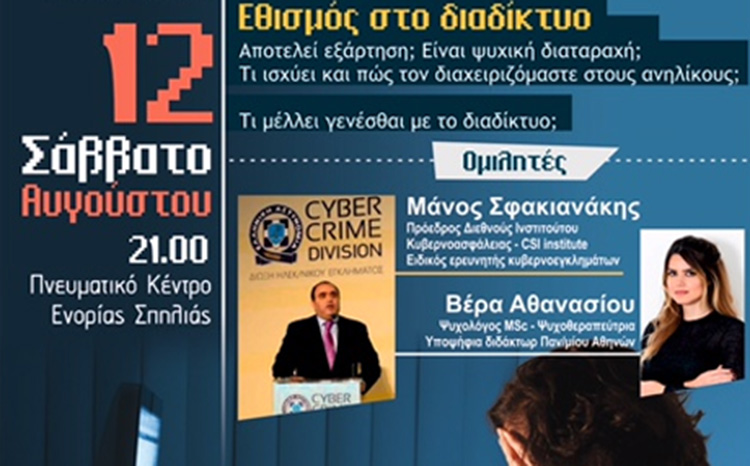 Το Σάββατο 12 Αυγούστου στις 21:00 στο Πνευματικό Κέντρο Ενορίας Σπηλιάς Κρήτης θα πραγματοποιηθεί ομιλία του Προέδρου του Διεθνούς Ινστιτούτου Κυβερνοασφάλειας - CSI Institute Μανώλη Σφακιανάκη και της ψυχολόγου Βέρας Αθανασίου για όλα πρέπει να γνωρίζουν οι χρήστες του διαδικτύου.